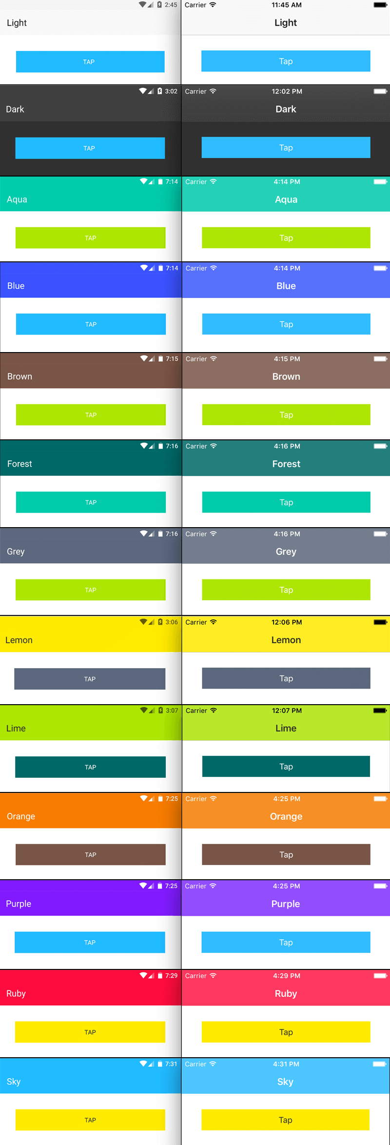 Note: This image shows all 13 color schemes on iOS and Android, and can help you decide which color scheme is a good fit for your app.